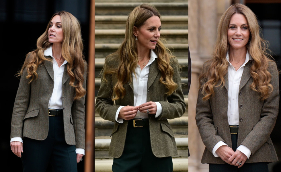 Su presencia transmitió vitalidad y frescura, ya que el nuevo look, producto tanto de un estilo trabajado como del efecto del sol y el aire marino del verano, dio un aspecto juvenil, moderno y luminoso a su figura. Kate escogió para la ocasión un atuendo elegante de inspiración otoñal: camisa blanca abotonada, blazer en tono neutro, pantalones de corte recto y accesorios discretos que reforzaron su imagen de sobriedad y cercanía.
